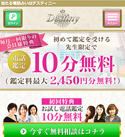 10年以上の運営実績を持つデスティニー。 鑑定歴の長い先生も多数在籍。ざわちん さんを占って話題を呼んだ「鈴城ゆき乃先生」もいます。実力のある占い師に低価格で鑑定してもらえるのも魅力。サポート体勢もバッチリで初心者の方も安心して相談できます。